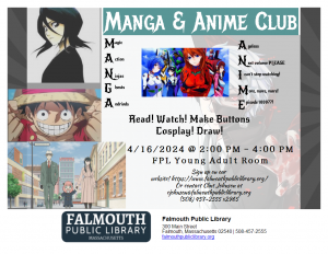 Manga and Anime club are back in business! Please come join on us in the Young Adult Room for our meeting on Tuesday, April 16, 2024 (4/16/2024) from 2 PM - 4 PM.